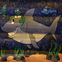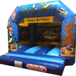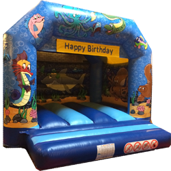 A MEDIUM SIZED PROFESSIONALLY HAND-PAINTED UNDERSEA WORLD THEMED BOUNCY CASTLE. A REAL HIT WITH ALL CREATURES GREAT & SMALL.